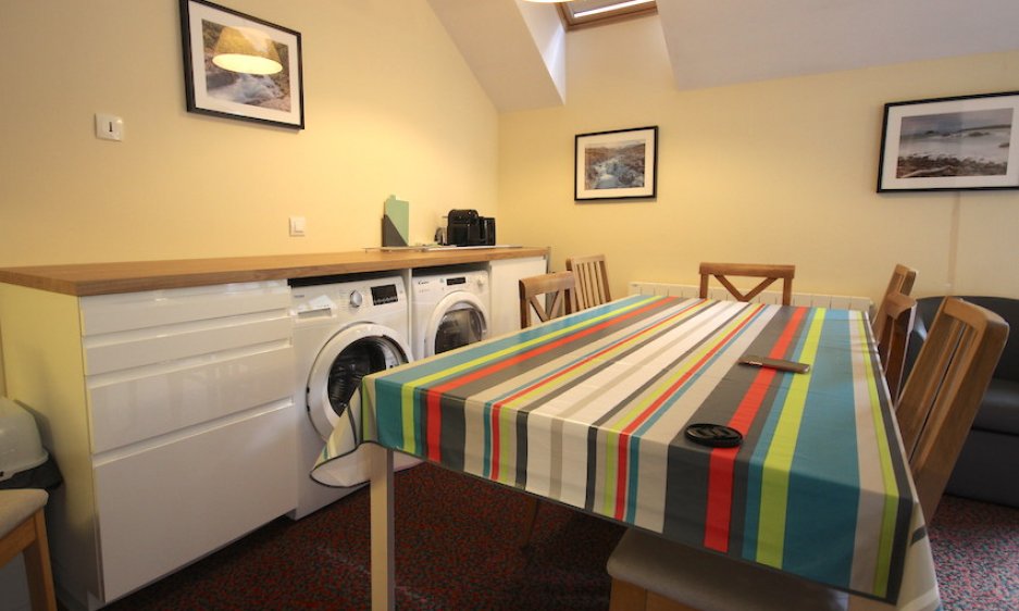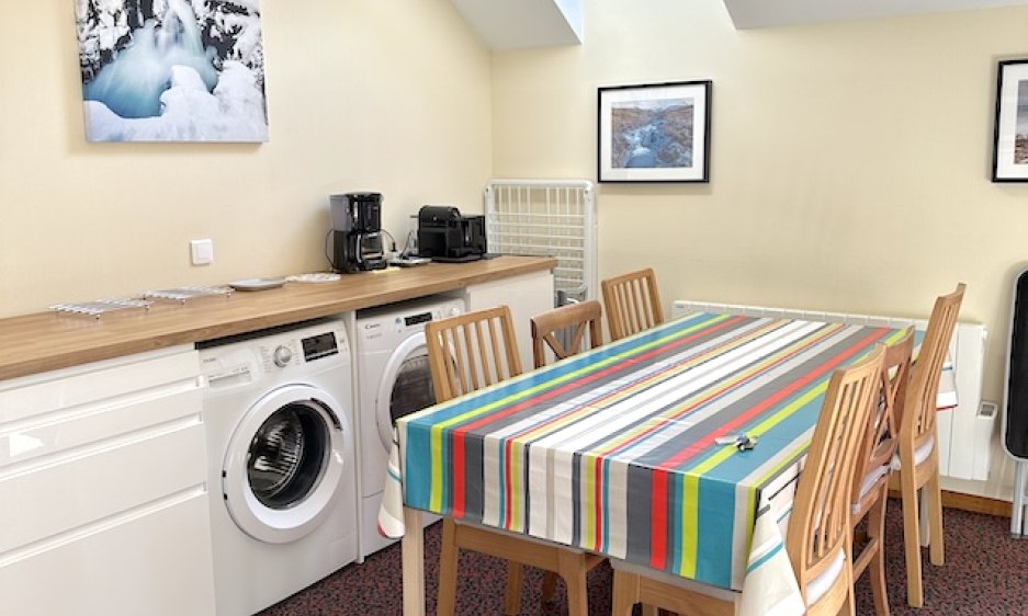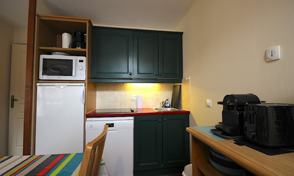 Coin cuisine tout équipé : lave-vaisselle, plaques à induction, grand réfrigérateur, micro-ondes, cafetière Nespresso, lave linge et sèche linge